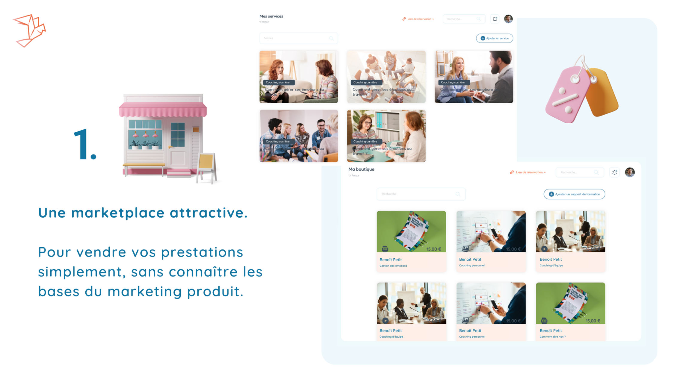 Pour commencer, la marketplace de master-coach.fr représente votre boutique. Elle vous permet de vendre vos prestations et vos contenus de manière simple et efficace. Grâce à une interface attractive, vos apprenants et vos prospects peuvent trouver facilement leur bonheur auprès de vous.
