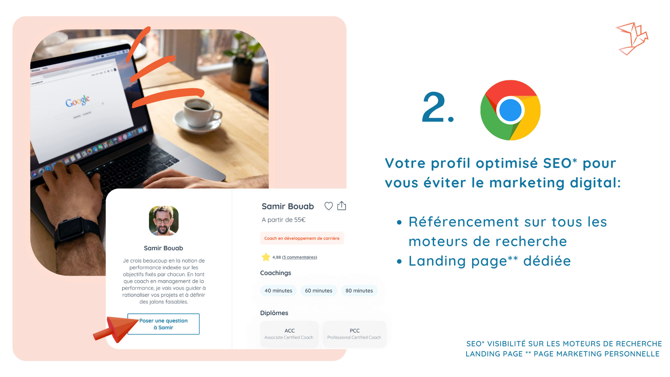 Ensuite, afin d’améliorer votre référencement sur Google, votre profil est optimisé SEO. Cette fonctionnalité vous aide à gagner en visibilité sur les moteurs de recherche. A titre d’exemple, lorsque qu’une personne souhaite améliorer ses compétences grâce à une formation, elle écrit ce qu’elle recherche sur Google. Grâce à notre outil, elle a plus de chance d’arriver sur votre profil, qui correspond bien entendu à ce qu’elle recherche. De plus, grâce à votre landing page, votre personal branding sera amélioré !